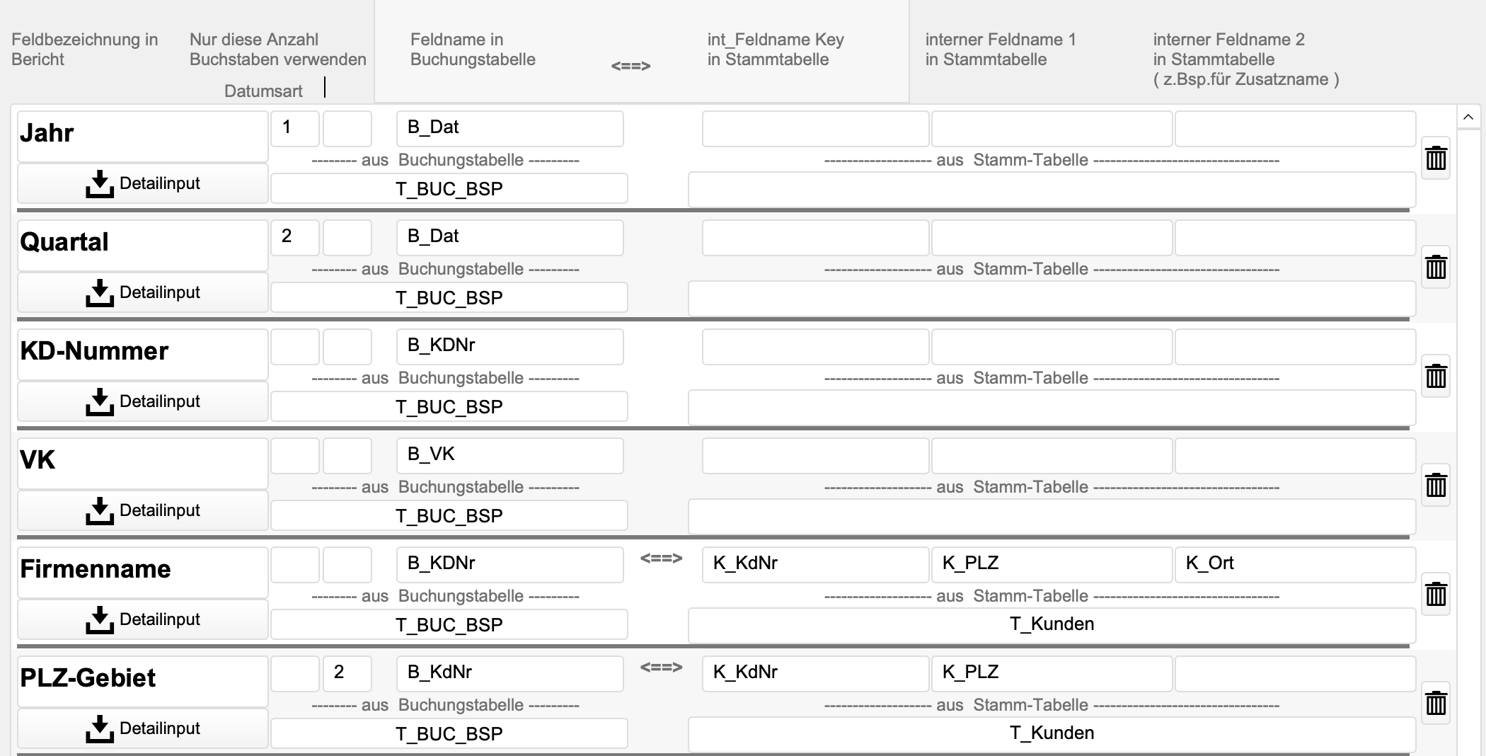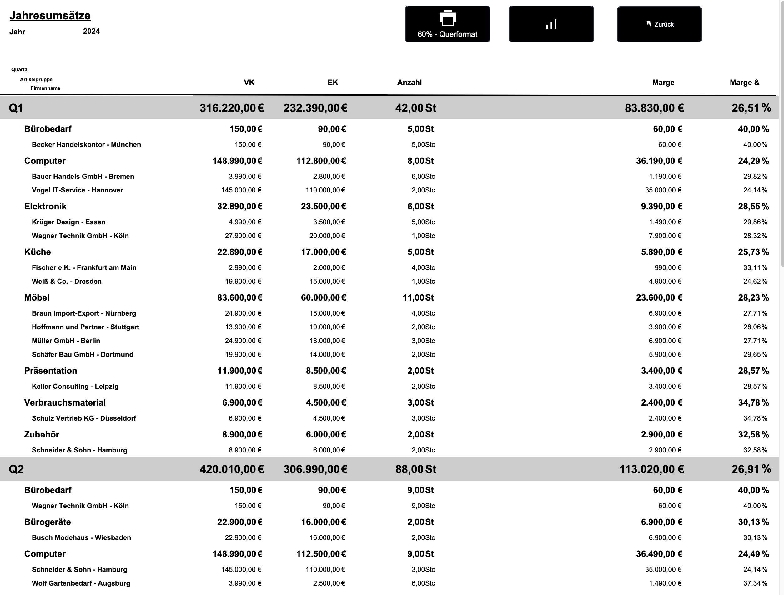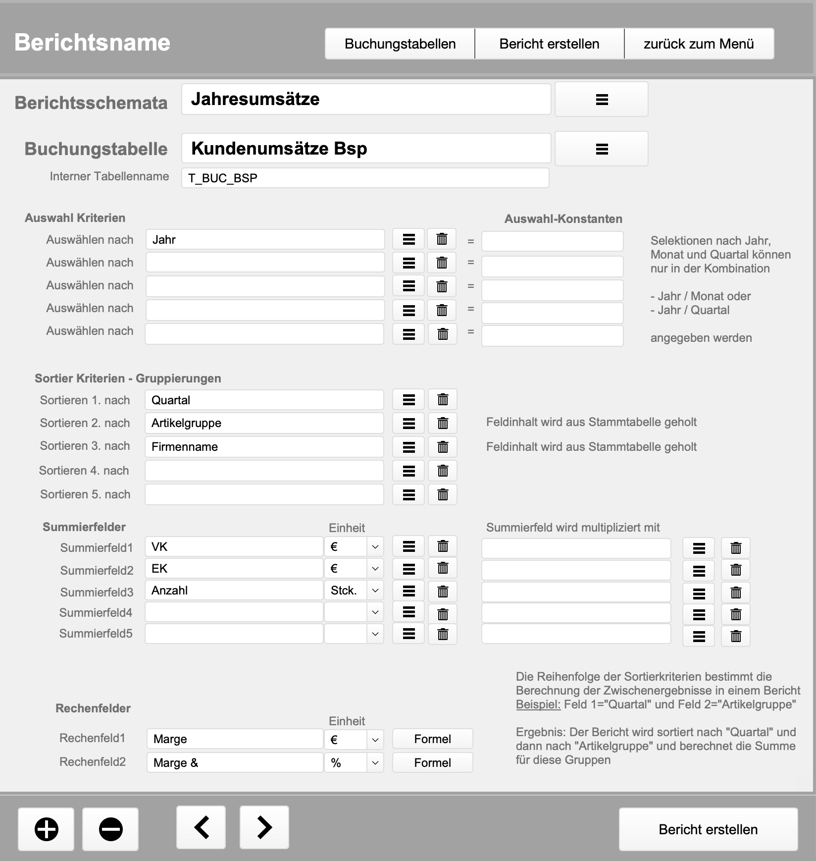 Mit diesem Report-Generator lassen sich bis zu 5 Selektionskriterien und bis zu 5 Gruppierungen angeben.Für bis zu 5 Zahlenfelder lassen sich verdichtete Summen gemäß den Gruppierungsvorgaben ausgeben.Weiterhin sind 2 Rechenfelder, für die ein Formeleditor zur Verfügung steht, in den Report integriert.